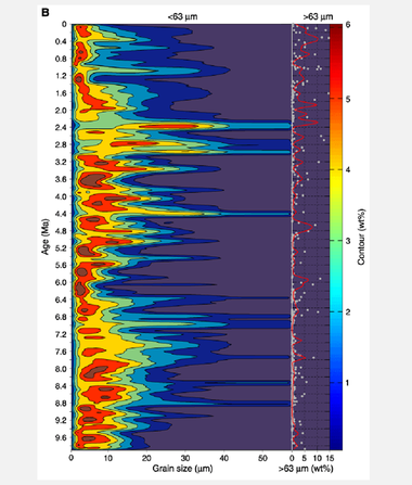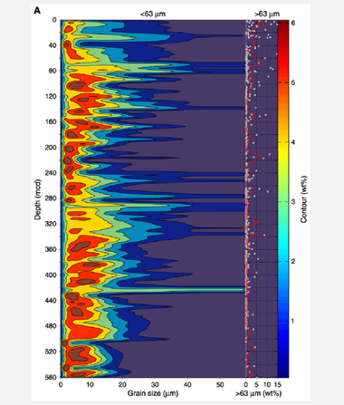 The obtained material was analysed with an ANALYSETTE 22 and the results evaluated in different manners. Exemplary shown here are here so called contour-plots of the fine share against the drilling depth respectively the age of the sediment, like it was received from magnetic examinations. The share larger than 63 µm is also in each case shown in a separate column.
