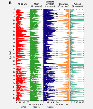 T. Moerz, und T.C.W. Wolf-Welling, 2001. Data report: Fine-fraction grain-size distribution data and their statistical treatment and relation to processes, Site 1095 (ODP Leg 178, western Antarctic Peninsula). In Barker, P.F., Camerlenghi, A., Acton, G.D., und Ramsay, A.T.S. (Eds.), Proc. ODP, Sci. Results, 178 [Online]. Available here: Publications