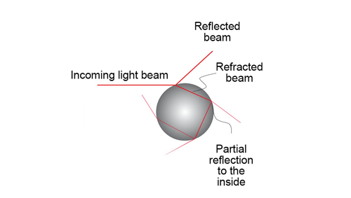 A light beam that hits a rain drop, for example, is first refracted toward the middle of the drop and then repeatedly reflected into the drop again upon encountering the drop‘s outer edge. A portion of the light also escapes the drop during each reflection.