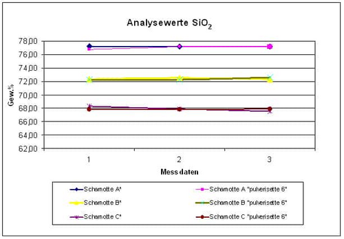 Illustration A: Comparison of the weight % of SiO2 of various fireclays from past preparation methods (firing clays A*-C*) prepared with the FRITSCH Planetary Mono Mill PULVERISETTE 6 classic line.