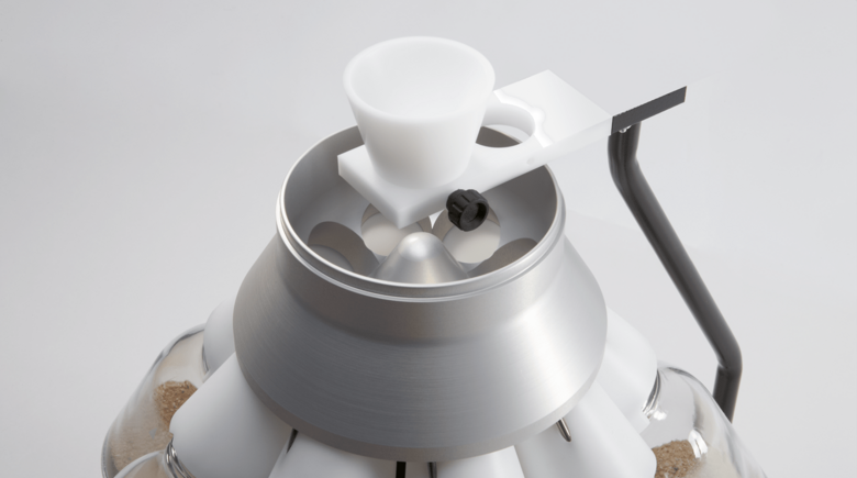 The sample feed funnel of the LABORETTE 27 guides the sample material centred onto the point of the rotating cone. The rapid rotation of the entire system accelerates the sample material outwards along its surface and divides it through up to 30 guiding channels into chemically and physically precisely identical subsamples. Your advantage: greatest division precision during sample division for the best possible accuracy and representative samples. For the division of liquid samples, the funnel is simply repositioned for eccentric division.