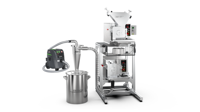 This smaller sample is then automatically comminuted in the PULVERISETTE 19 down to a final fineness of 0.1 mm and drawn into the collecting vessel by the connected FRITSCH high-performance Cyclone separator.