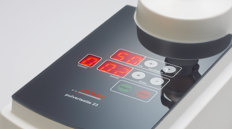 The FRITSCH Mini-Mill PULVERISETTE 23 grinds the sample through impact and friction between grinding balls and the inside wall of the grinding bowl. For this, the grinding bowl performs vertically oscillating movements with 900 – 3,000 oscillations per minute at 9 mm amplitude.